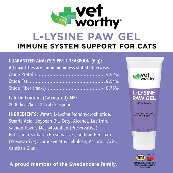 Immune system support. Apply to your cat’s paws to stimulate licking. 500 mg L-Lysine per 2 teaspoons. This veterinarian formulated paw gel is amino acid support in an enticing salmon flavor your cat will love. Add to paw to stimulate licking.