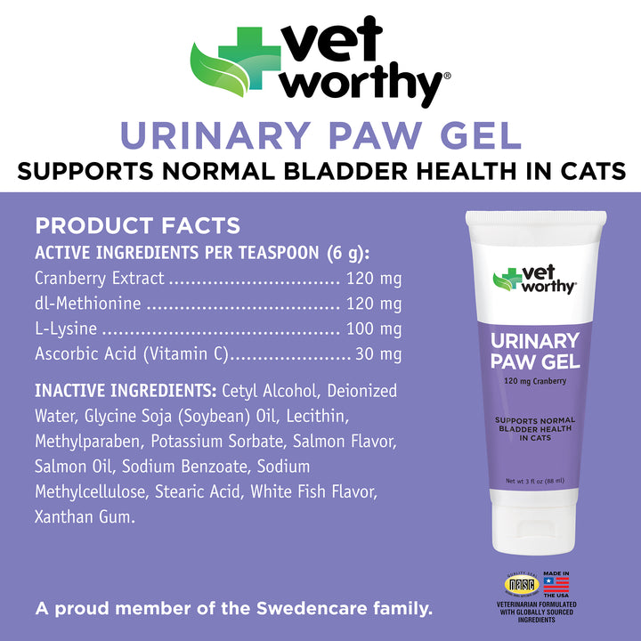 Supports normal bladder health in cats. Veterinary formulated with cranberry extract, dl-methionine, l-lysine and vitamin c. Salmon flavored gel that cats love. Add to paw to stimulate licking.