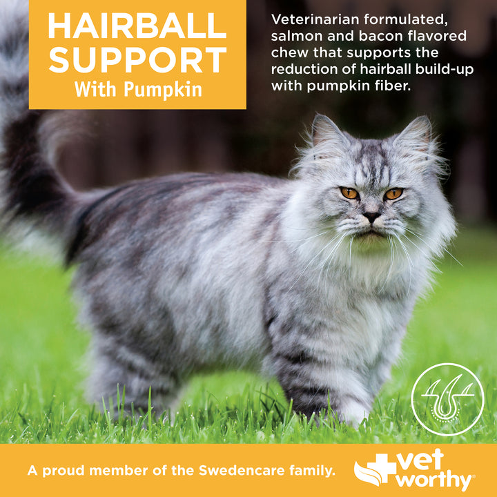 Vet Worthy Hairball Support w/ Pumpkin is for use in cats over the age of 12 weeks. Helps eliminate and prevent hairballs when used on a daily basis.