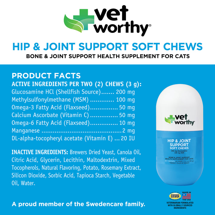 Recommended to ease joint stiffness due to normal daily exercise and activity as a daily routine for advanced care. This veterinarian formulation enhances the functions of the joint and connective tissue and is an enticing flavored soft chew your cat will love.