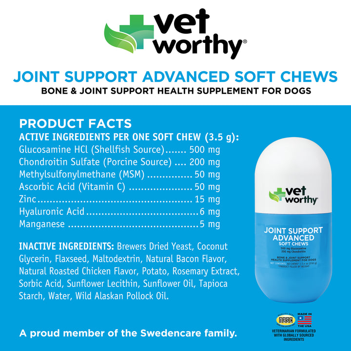 Recommended to ease joint stiffness due to normal daily exercise and activity as a daily routine for advanced care. This veterinarian formulation enhances the functions of the joint and connective tissue and is an enticing soft chew your dog will love. These dog joint chews contain Glucosamine, Chondroitin, MSM, Vitamin C and Hyaluronic Acid. This variant is recommended for advanced joint care support.