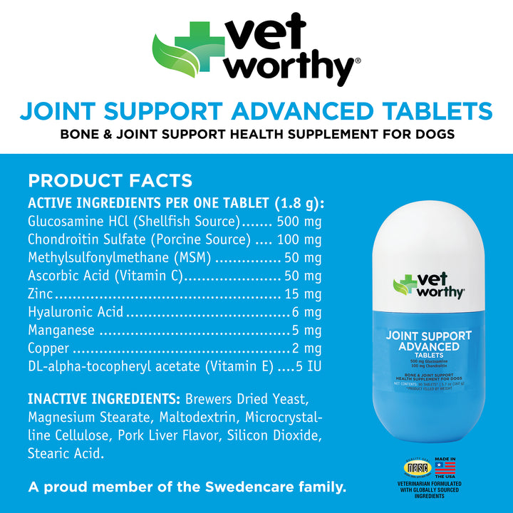 Recommended to ease joint stiffness due to normal daily exercise and activity as a daily routine for advanced care. This veterinarian formulation enhances the functions of the joint and connective tissue and is an enticing chewable tablet your dog will love. These dog joint tablets contain Glucosamine, Chondroitin, MSM, Vitamin C and Hyaluronic Acid. This variant is recommended for advanced joint care support.
