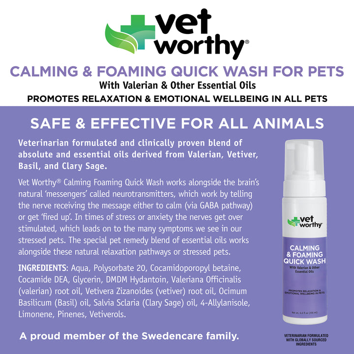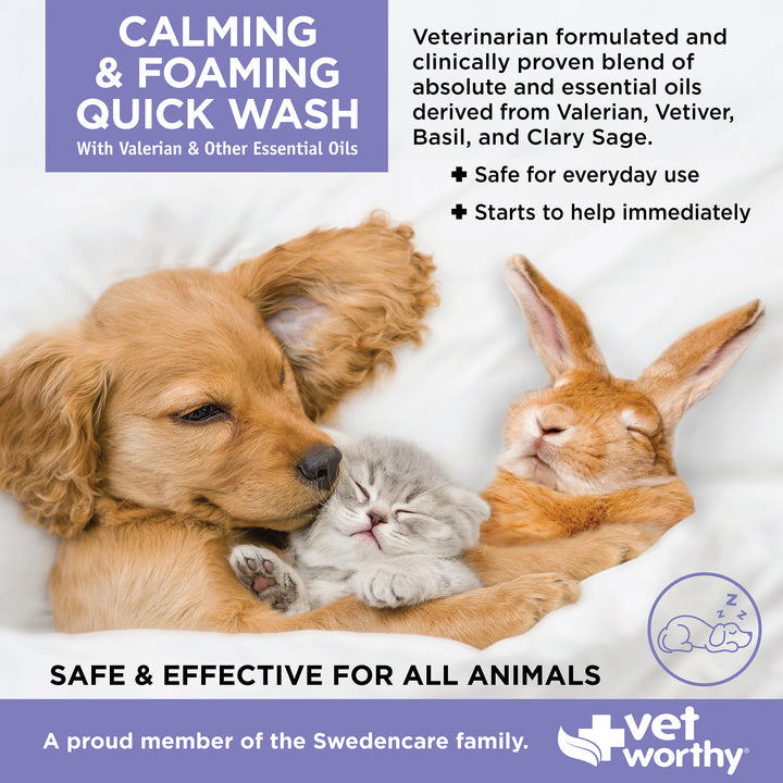 Featuring a clinically proven blend of valerian, vetiver and calming essential oils, this convenient quick wash helps your pets produce neurotransmitters that can calm their nerves in stressful situations. Its pH neutral formula is ideal for use around all birds and mammals, including rabbits, rodents and horses. This quick wash is especially easy to use on-the-go, helping instantly soothe your sidekick for 2-6 hours.